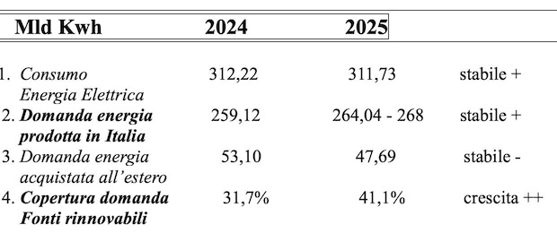 2025 stabile, pari al 2024. Secondo il Rapporto 2025 di Terna, nell’anno i consumi elettrici italiani sono di 311,3 TWh, un valore in pratica equivalente a quello del 2024. Lo scorso anno le fonti rinnovabili hanno coperto il 41% della domanda, rispetto al 42% del 2024. Tale risultato è la conseguenza di due effetti antitetici: il record annuale di produzione fotovoltaica, contro una produzione idroelettrica tornata a valori regolari rispetto all’elevata idraulicità registrata nel 2024.