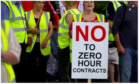 Giovani, e meno giovani, attaccati allo smartphone in attesa di una chiamata per un lavoro mal retribuito; regolato da un “contratto a zero ore”. Questo tipo di contratto paga solo per le ore lavorate; ma non venite pagati per il tempo che passate ad aspettare una telefonata, anche se questo vi impedisce di fare altre cose. E’ il contratto tipico della “gig economy”; il Regno Unito insegna.